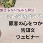 満員御礼が続く嬉しさと安心感。 たった30分で集まる告知文のコツがわかるウェビナーを、今だけ9割オフで。 時代は変わっても、こんなお悩み...